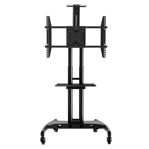 This TV mount and stand fits a flat panel screen ranging in size from 32″ – 70″ / 100lbs (45.5kg) in a standard landscape (horizontal) orientation. A/V component shelf (18″W x 12″D) included with a 10 lbs (4.5kg) load capacity. Telescopic height adjustment from 41.3″ – 59″ to top of TV mount.